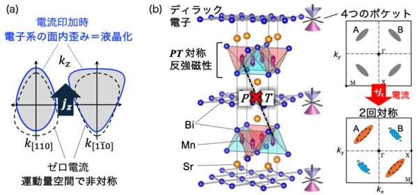 図1. (a) PT対称磁性体の電子状態(フェルミ面)の概念図。電流印加によりフェルミ面がシフトし、系全体で面内方向に歪んだ電子ネマティック液晶状態が実現する。(b) SrMnBi2の結晶構造の模式図(左)。四面体に囲まれたMnサイトがPT対称反強磁性秩序を示す。二次元Bi層のディラック電子が形成する電子ポケットの概念図(右)。層間方向の電流により、面内で等方的な4回対称から異方的な2回対称(ネマティック状態)となる。