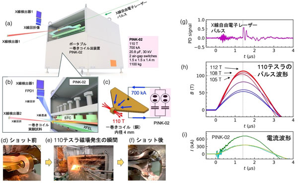 図1 ポータブル110テスラ発生装置PINK-02の概要とXFEL施設SACLAでの破壊型パルス磁場実験の様子