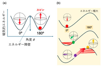 図1. (a) 一軸の磁気異方性を有する磁石のエネルギーの角度依存性の模式図。南極方向からの角度θが0ºと180ºでエネルギーが極小となり、安定な状態となる。(b) 等方性磁石に外部磁場を印加したときのエネルギーの角度依存性の模式図。θ = 0ºのみがエネルギー的に安定な状態であるが、外部からスピントルク(太い赤色の矢印)を作用させることにより、まるで逆立ちした振り子が激しい振動によって直立を維持するように、本来は不安定なはずの磁場と真逆の向き(エネルギーが最も高い山の頂上の状態)』でスピンを安定して保持(動的安定化)できるようになる。
