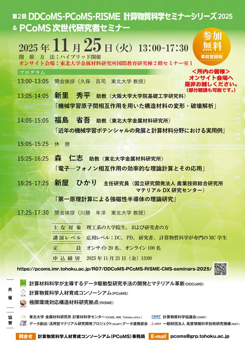 | 申し込み | ※事前登録制※ 概要および事前申込用URL: https://pcoms.imr.tohoku.ac.jp/R07/DDCoMS-PCoMS-RISME-CMS-seminars-2025/ |