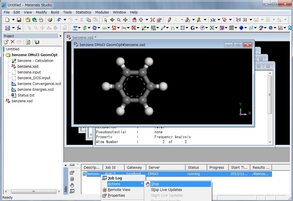Materials Studio 画面右下の「Jobs」ペインで対象のジョブを右クリックし、プルダウンメニューの「Actions」から「Stop」を選択します。