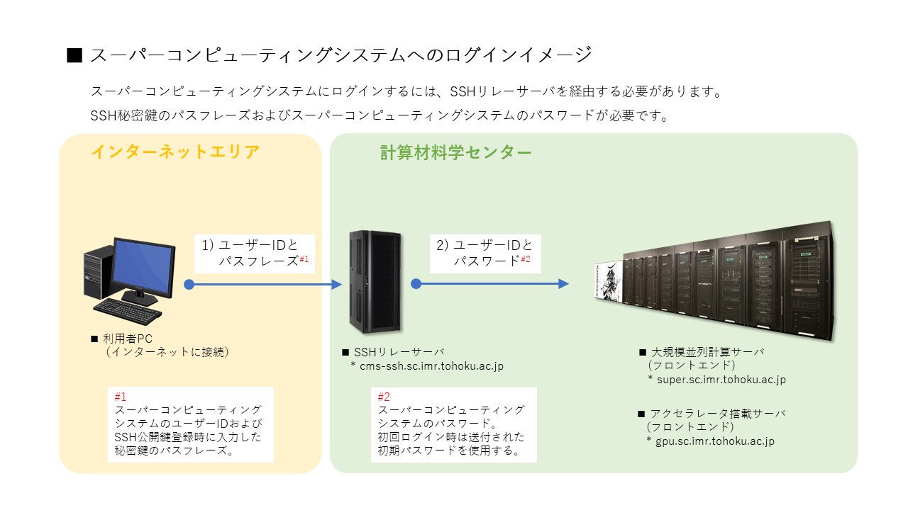 初めてスーパーコンピューティングシステムに接続される方は、 公開鍵登録システム にログインしてSSH公開鍵を作成してください。